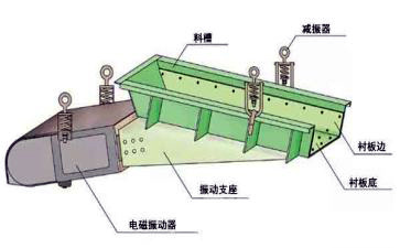 主要利用電磁激振器驅動槽體以定的傾角做往復振動,使物料沿槽移動。在交流電的正半周,脈動電流流過線圈,在鐵芯和銜鐵之間產生一脈動電磁吸力,使槽體向后運動,激振器的主彈簧發生變形,儲存勢能;