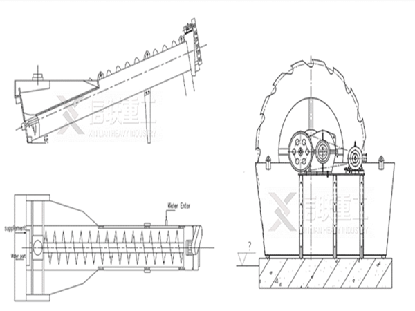 輪式洗砂機由齒輪、葉輪、三角帶、減速機、洗料槽等部件組成,輪式洗砂機工作時,由電動機帶動三角帶、齒輪、減速機,齒輪的轉動帶動葉輪的轉動,在葉輪的帶動下,洗料槽中的砂石發生翻滾,同時發生相互研磨的現象,通過翻滾、研磨的運動,砂石表面的雜質就會被除去,干凈的砂石會被葉片帶走,然后,干凈的砂石會被旋轉的葉輪倒入出料槽,砂石的清洗工作就完成了。